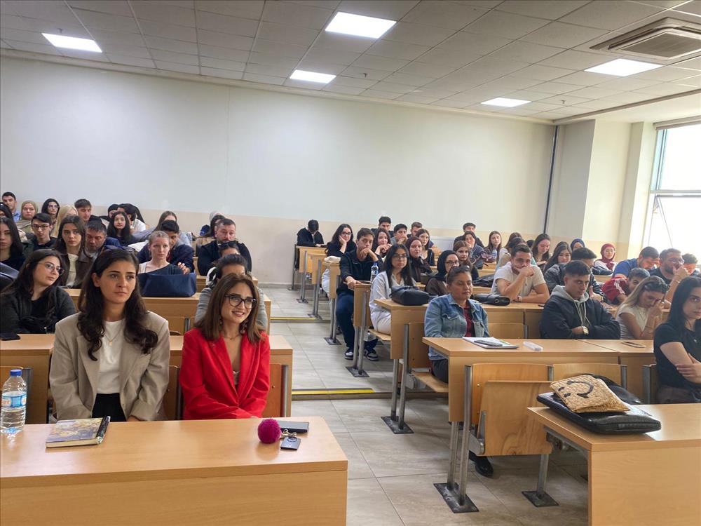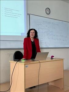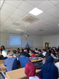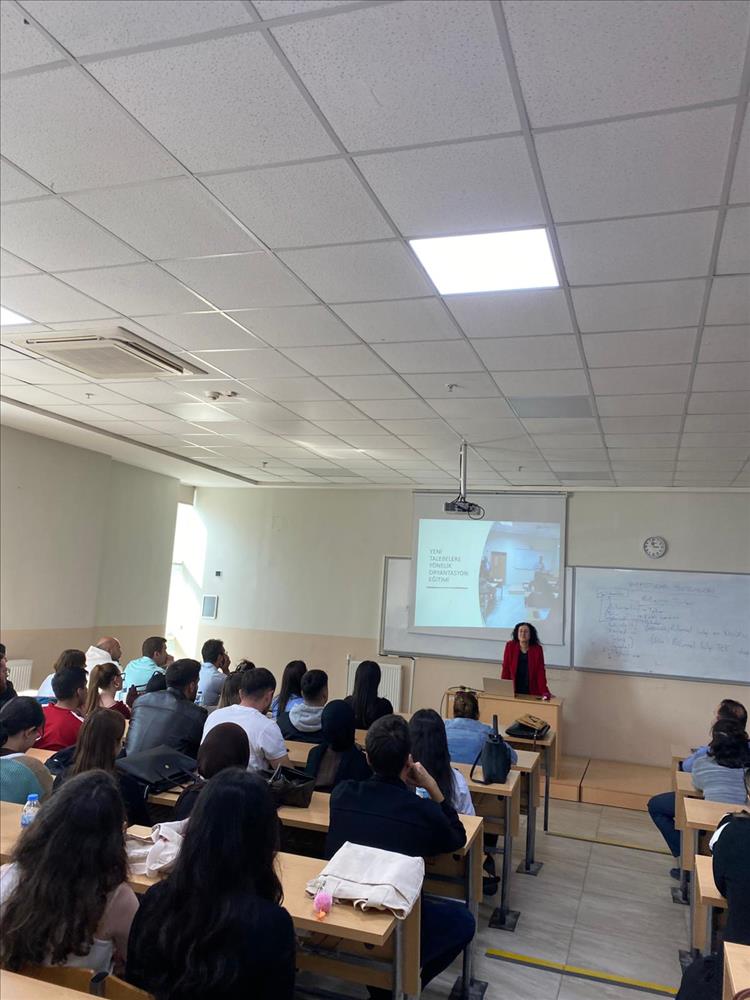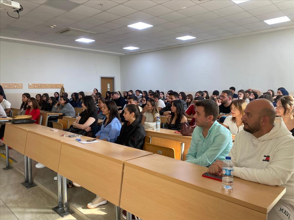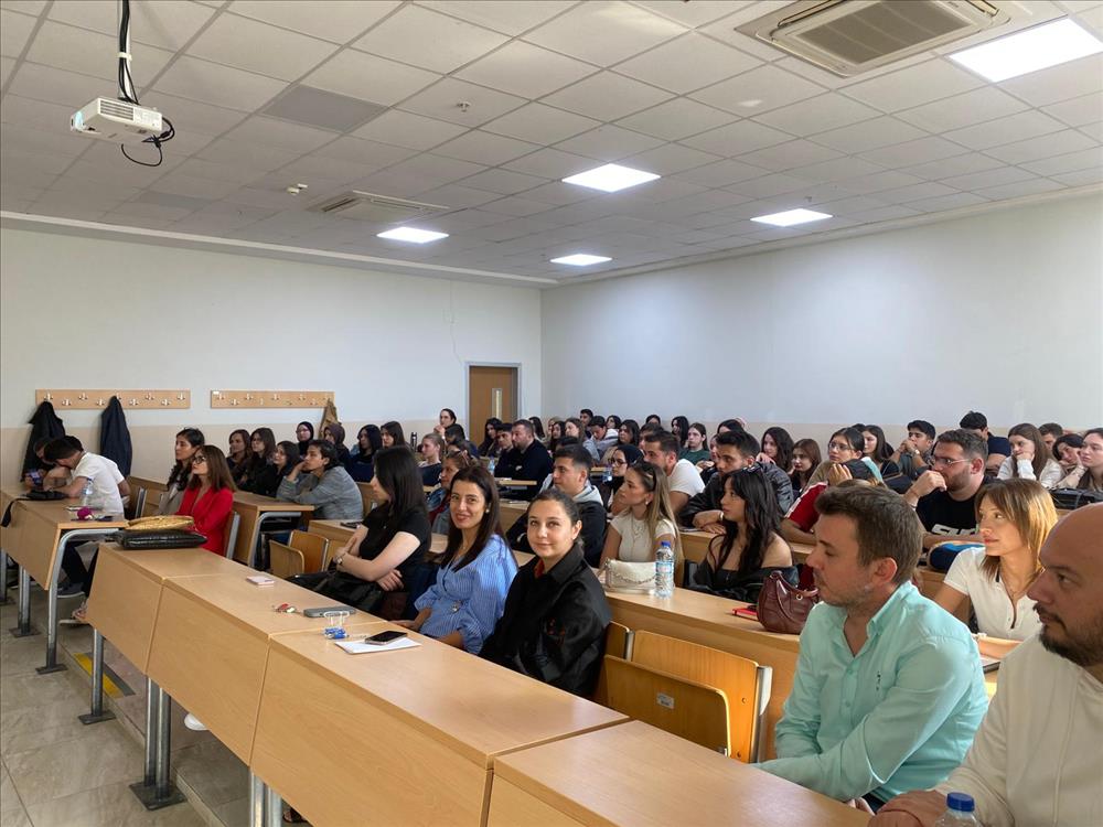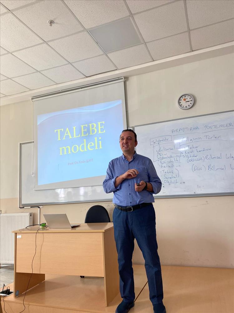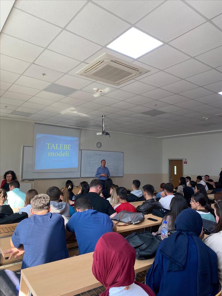 Bölüm başkan yardımcımız Prof. Dr. Ersin KAVİ öğrencilerin akademik ve kişisel gelişimlerine rehberlik edecek “TALEBE Modeli” adlı yaklaşımı tanıttı. “TALEBE” adının, Takip, Araştırma, Lisan, Etik, Bilgi Teknolojileri ve Etkinlik kavramlarının baş harflerinden oluştuğunu belirten hocamız, bu modelin öğrencilerin üniversite yaşamında başarılı olmaları ve gelecekte donanımlı birer mezun olarak iş hayatına atılmaları için önemli bir yol haritası sunduğunu ifade etti. Sunumda, öğrencilerin derslerini ve akademik gelişimlerini yakından takip etmeleri, bilimsel meraklarını araştırma ile desteklemeleri, en az bir yabancı lisan öğrenmeleri, akademik ve mesleki yaşantılarında etik değerlere bağlı kalmaları, çağın gereği olan bilgi teknolojilerini etkin biçimde kullanmaları ve sosyal-akademik etkinliklerde aktif rol almalarının önemine vurgu yapıldı.